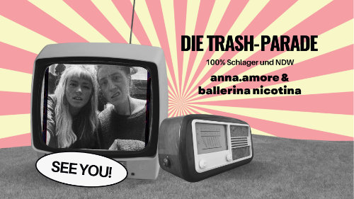 mehr InfosSchlager trifft NDW, Humor trifft Herz: Die Trash-Parade verwandelt die GrooveStation in einen Tanztempel des guten schlechten Geschmacks. Mit anna.amore und ballerina nicotina wird's garantiert wild!