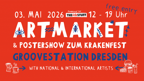 Während der Besuch am 1. und 2.5. mit Festivalticket und während der Konzerte abends möglich ist, kann am 3.5. nochmal richtig geshoppt werden: zum Artmarket von 12 bis 19 Uhr sind die meisten Poster-Künstler*innen mit noch mehr Merch und Waren anwesend, es gibt Kaffee & Kuchen, musikalische Untermalung vom Dresdner Electronics Duo SORSE, man kann eigene mitgebrachte Sachen mit Krakenduftmerchmotiven bedrucken, es gibt Zuckerwatte, den Pieces for Peace Pop-Up-Shop mit Glücksrad für den Guten Zweck und ein Spezial-limitiertes Burgergrillen von Kumpel3000.